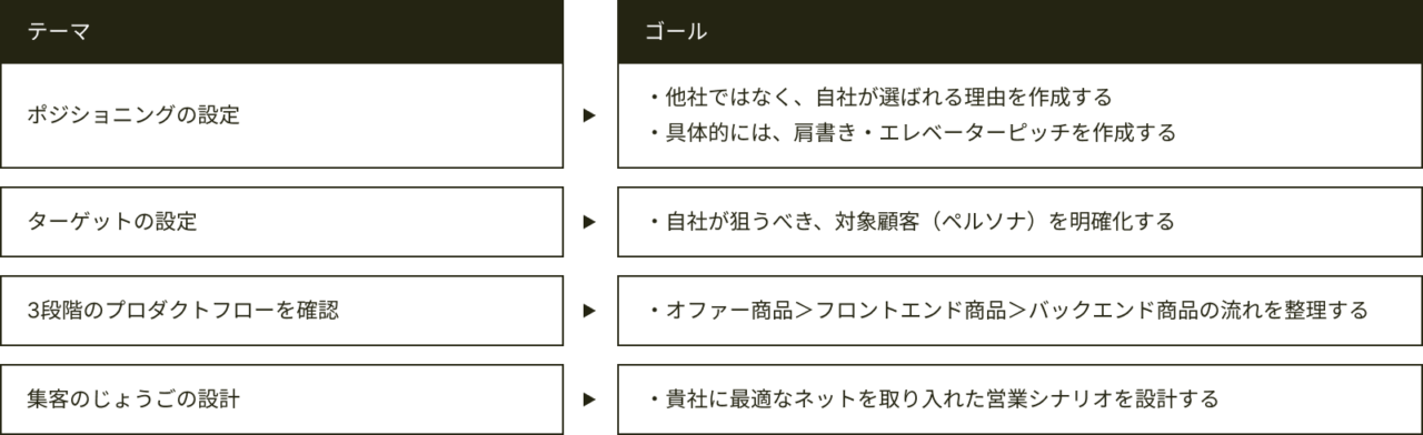 • 他社ではなく、自社が選ばれる理由づくり(ポジショニング)