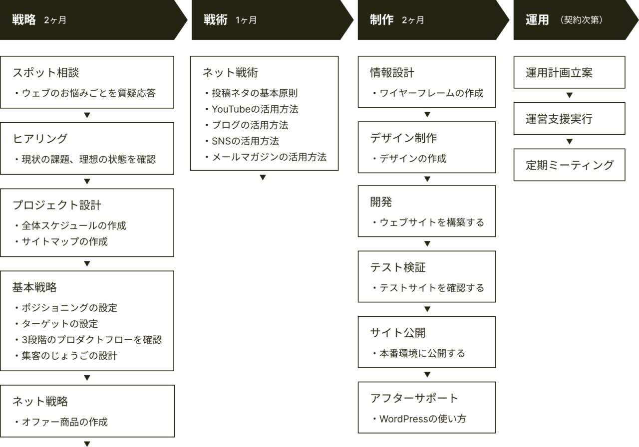貴社のポジショニング・ターゲットの設定・商品の売り方などの戦略から、YouTube・SNS・ブログ・メルマガなどの戦術まで、一貫してサポートすることが可能です。